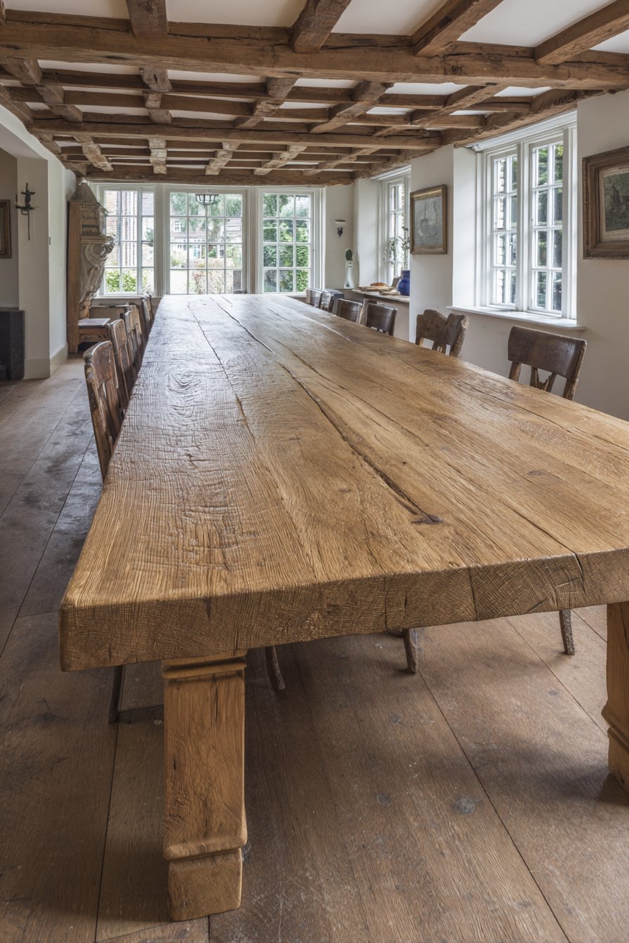 Key Design Tips: Choose solid oak throughout rather than veneer for longevity and authentic character. Embrace hand-planing marks and slight irregularities as evidence of craftsmanship. Select turned leg designs with substantial diameter to support large table proportions visually and structurally. Mix chair styles deliberately rather than trying to find matching sets. Ensure adequate floor space around the table—allow minimum 36 inches clearance on all sides for comfortable circulation. Apply durable finishes that can withstand heavy family use while remaining easy to maintain. Consider extension mechanisms if you need flexibility between everyday use and large gatherings.