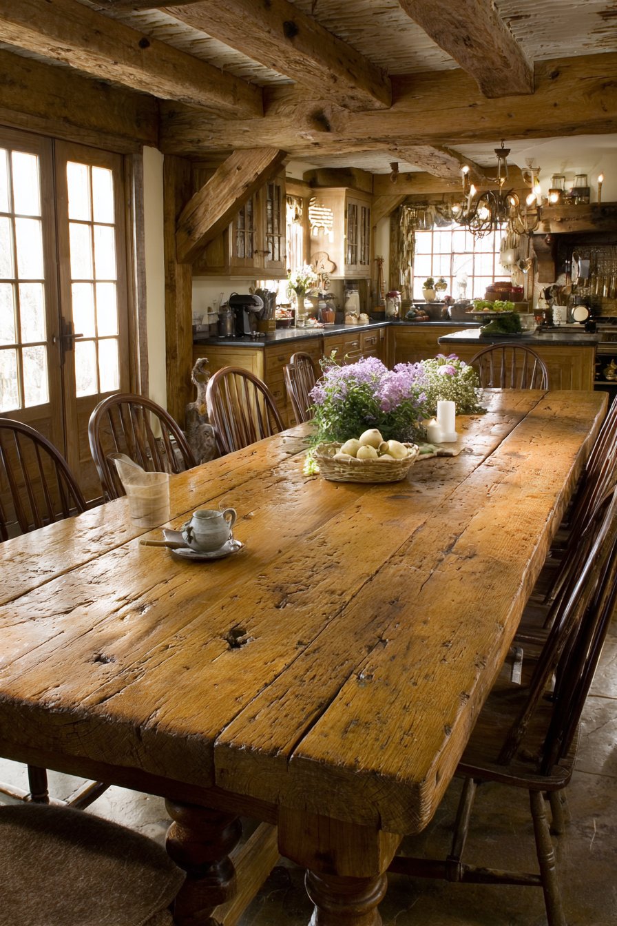 Mismatched vintage wooden chairs collected over time surround the table, each piece contributing its own history and character to the overall composition. This eclectic seating arrangement embodies the farmhouse aesthetic’s appreciation for authenticity over coordination, creating visual interest while accommodating various body types and seating preferences. Natural daylight streaming through generous windows illuminates the oak’s grain variations and highlights the hand-planed surface texture that distinguishes this table from machine-processed alternatives.